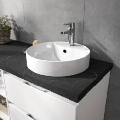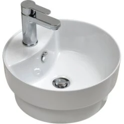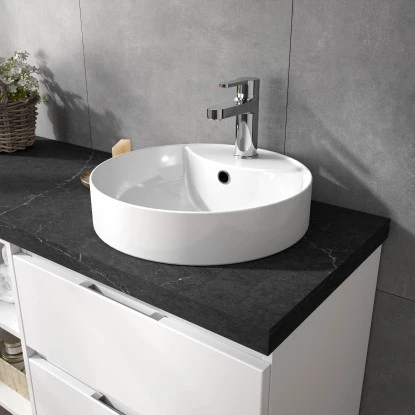 Modernes Design made in Germany: Das weißglänzende Aufsatzbecken besticht durch seine runde Form.