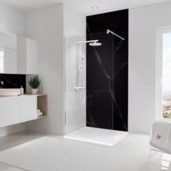 Die Schulte Duschrückwand Stein aus der DecoDesign-Serie (Softtouch Edition) ist eine fugenlose Wandverkleidung in Marmor-Schwarz-Optik mit den Maßen 255 cm x 100 cm. Sie lässt jedes Bad in einem völlig neuen Look erstrahlen und begeistert bei der ersten Berührung mit seiner seidenweichen Beschaffenheit. Trotz ihrer edlen Optik und Haptik erweist sich die Duschrückwand zugleich als überaus robust und unempfindlich gegenüber Kratzern, Sonnenlicht und Hitze bis zu 80 °C.