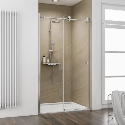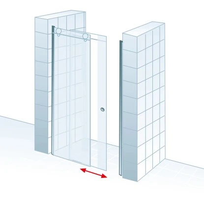 Die Gleittür in Nische MasterClass bietet Ihnen viel Platz zum Duschen, lässt sich jedoch gleichzeitig sehr platzsparend öffnend. Das Festelement befindet sich auf der linken Seite. Wir empfehlen Ihnen bei der Gleittür in Nische die Montage ohne Duschbecken oder auf einem Schulte Duschbecken mit einem Wannenrand > 7 cm.