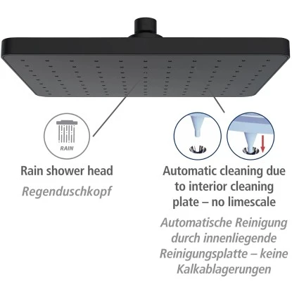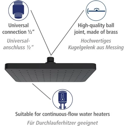 Nie wieder verkalkte DĂŒsen! Automatische Reinigung durch innenliegende Reinigungsplatte – kein Komfortverlust durch verstopfte DĂŒsen. GleichmĂ€Ăige Wasserverteilung bleibt dauerhaft erhalten. Lange Lebensdauer auch bei sehr kalkhaltigem Wasser. Universalanschluss 0,5″. FĂŒr Durchlauferhitzer geeignet. Hochwertiges Kugelgelenk – Messing verchromt. Kopfbrause mit 1 Funktion.